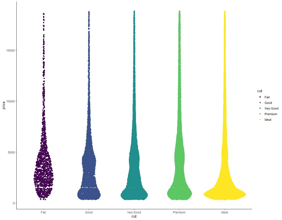 ggplot2::ggplot(mapping = aes(x = cut, y = price, color = cut)) +