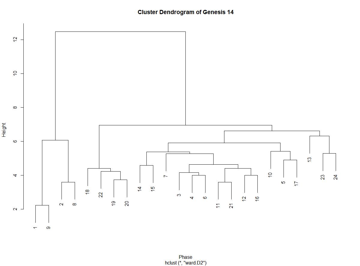 여기서 행은 각 절이 되고, 열은 각 절에 있는 단어들이다.유클리드 거리를 이용하여 계층적(또는 위계적) 군집분석(Hierarchical Clustering Analysis)을 할 결과이다.